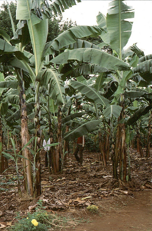 | Demonstration and evaluation trial at Kalema Bukoba District In December 1989, 13 months after planting. Seen from house end in Plot FC2, plant in Plot F with a bunch |