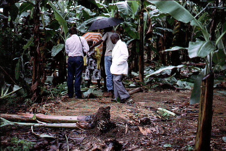 | Toppling of healthy bananas by wind and rain Near Kayanga, Bukoba District, March 1988 |