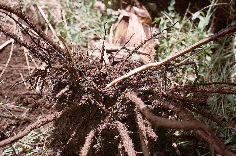 | Nematode damaged roots Kiilima, Bukoba District, May 1989 Note the peripheral purplish discolouration of the externally healthy roots and the typical dried up and rotted roots. Click here for a close-up and also. |