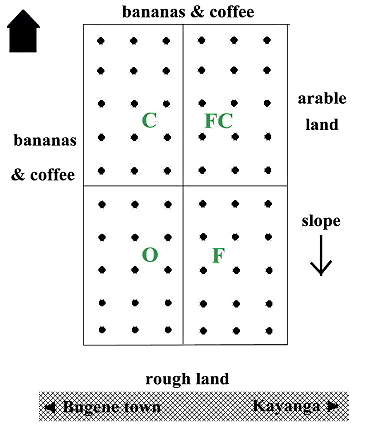 The site was just to the north of Bugene township, at approximately 1615 m (5300 feet) asl. The site was markedly sloped and too small for the full size trial. Planting was on 12.4.89. Shamba owner Mr F Bikongoro. |