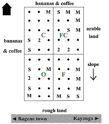 Evaluation visit An inspection was made on 1.12.89, 8 months after planting. The site was in good condition, except for some damage by goats; 1 or 2 = sucker numbers; S = stunted; M = missing. A further 3 g a.i. of carbofuran had been applied to C2 and FC2 but the officer responsible was not present. |