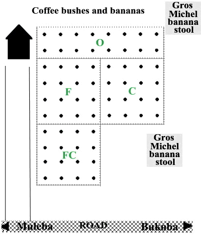 The site, shamba of Mr Yusto Barubuka, was alongside the main A1 road, 10 km from Bukoba (Tanzania Grid Reference UP625475) and at approximately 1280 m (4200 feet) asl. The site layout was as shown. Pre-planting all old corms inspected had major root destruction and most fresh roots infested with nematodes. Observed weevil damage was mainly to the exterior of the corms. Planting work started on 28.7.88 and was completed by 3.8.88; other than a few in the centre of Plot FC, held up by waiting for more manure, and finished on 26.9.88. Sadly a film with photographs of the planting and early growth was lost. On 16.12.88 almost all had germinated, the last being in Plot O. The whole was in good condition on 11.1.89. but by 2.2.89 Plot FC was markedly the better, then C, F and O (noticeably the poorest).The delayed FC plants had caught up with the earlier plantings. |