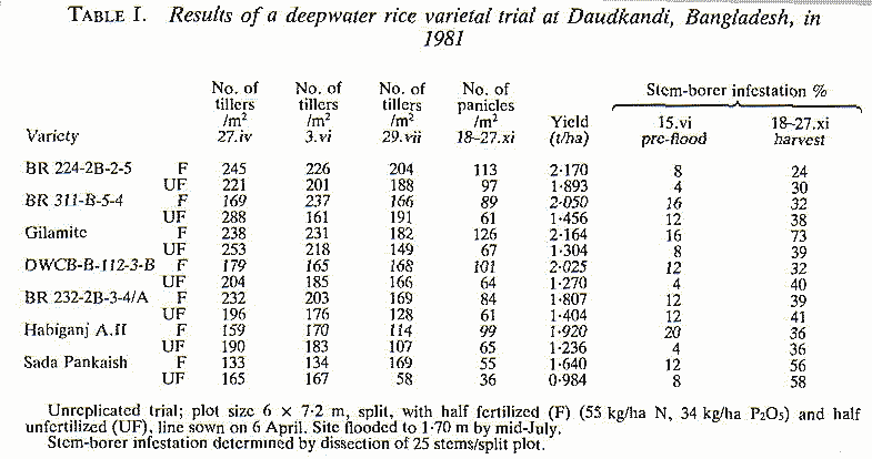The results cited by Catling et al. (1987) from small-scale pot and cage experiments in Bangladesh did appear to suggest that stem infestation has an effect on yield, but my careful examination of the original records showed that a different interpretation of the results is possible. For instance, the 1978 pot study with Habiganj Aman gave a yield reduction in the infested pots of 9.6 g/pot (36.7%). This could have been accounted for by the initial deadhearts in the infested pots, which at 4.3 per pot (each being direct loss of a primary panicle weighing 2.2 g), amounted to 9.5 g. This initial loss was offset by the development of secondary tillers, but these typically had lighter panicles. The subsequent 20% stem infestation may well have had no effect on the final yield. Also, in the small-scale experiments, the depth of water never exceeded 1 m, thus precluding the normal elongation of the plants which would occur under field conditions of water 2-3 m deep.