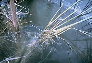 | Deepwater rice varieties are characterized also by the development of nodal roots (left) which assimilate nutrients from the water and thus counteract this death of the lower stem. In the open flooded fields, uprooting of deepwater rice plants is not uncommon, but it has been shown that yields may still be near that of non-uprooted plants (Alim & Zaman 1958). | |