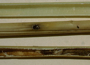| The exit hole (left) bored prior to pupation by the last instar larva is a potential weak point, but it is small relative to the large stems characteristic of deepwater rice. Entry by bacterial or fungal rot organisms is conceivable, although the hole is sealed with silk. The large elongated stems are fibrous, and it is common for the lower submerged internodes to die without loss of the stem as a connection between the original soil roots and the upper stem. |