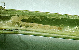 Larval feeding in young plants, with commensurately narrow tillers, can