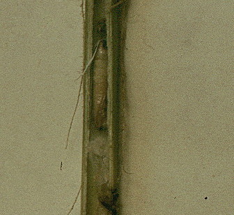 Stem samples were split longitudinally and examined for larvae, pupae and evidence of infestation (frass, exit holes, feeding damage and pupal skins). For some studies, the position of each infestation was recorded by noting the internodes affected, counting downwards from the topmost, or terminal, internode.