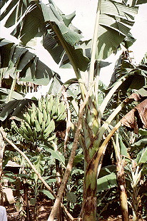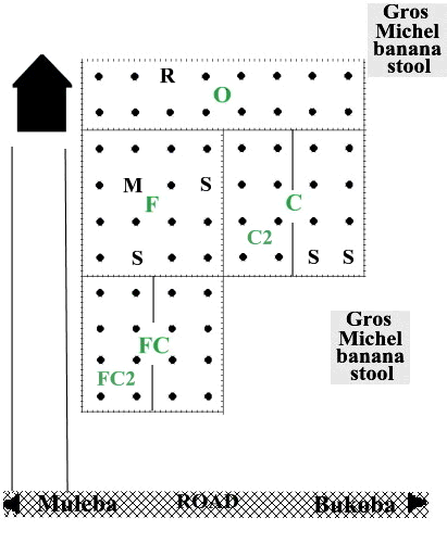 The site, shamba of Mr Yusto Barubuka, was alongside the main A1 road, 10 km from Bukoba (Tanzania Grid Reference UP625475) and at approximately 1280 m (4200 feet) asl. The site layout was as shown. Pre-planting all old corms inspected had major root destruction and most fresh roots infested with nematodes. Observed weevil damage was mainly to the exterior of the corms. Planting work started on 28.7.88 and was completed by 3.8.88; other than a few in the centre of Plot FC, held up by waiting for more manure, and finished on 26.9.88. Sadly a film with photographs of the planting and early growth was lost. On 16.12.88 almost all had germinated, the last being in Plot O. The whole was in good condition on 11.1.89. but by 2.2.89 Plot FC was markedly the better, then C, F and O (noticeably the poorest).The delayed FC plants had caught up with the earlier plantings. |