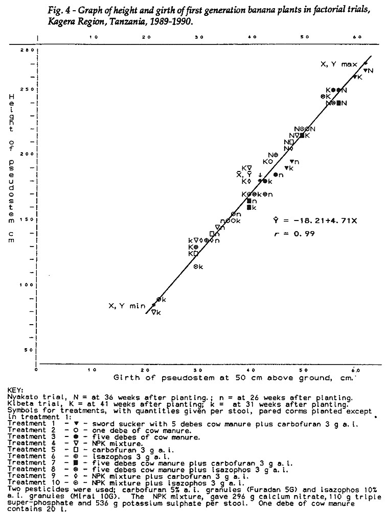 Correlations between pseudostem height and girth in the different treatments are shown in Figure 3, data from the demonstration and evaluation trials, and Figure 4, data from the factorial trials.