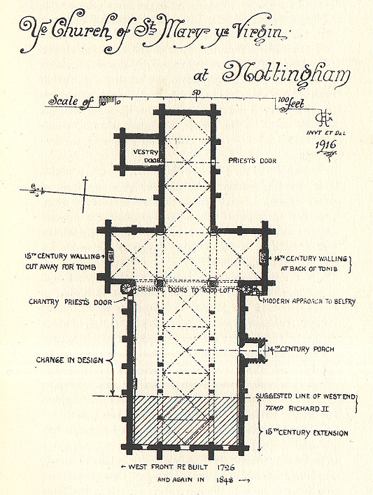 Turning to the Chancel, Gill described this as built of Gedling stone, probably after the main church was completed. The relative simplicity of construction he noted as at odds with the main body and from the "slender angle shafts" on the eastern edge of the tower piers concluded that the window form of the main church was intended to continue but did not. Gill thought the tower was built in the reign of Henry VII (1485-1509), arguing that it could not have been built prior to completion of the chancel as there would have been insufficient strength in the lower structure. Something which only he has noted is the presence of the strong "relieving" or "discharging" arch within each face of the tower just above the line of the roofs, designed to place the downward force onto the massive tower piers. The lower lights of the east and west faces of the tower were modified and the stone "stringing" altered in 1807 to accommodate the clock made by Thomas Hardy of Nottingham. To complete his description, Gill provided a speculative plan of the building when first complete (right).