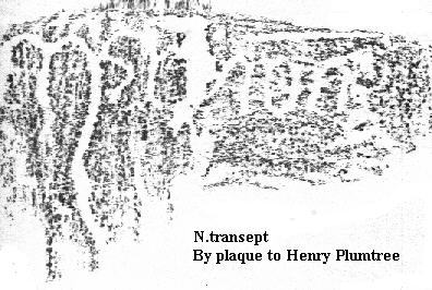 To return to the stonework bearing a button cross or a tristar, and there is never more than one mark on an individual piece of masonry, perhaps the most exciting find was that alongside King Richard's Head. On the right of the ancient and original doorway in the north aisle, leading into what most think was a Chantry House. The various locations of the button cross and tristar, moreover tell us much about the period of construction of the present building. In addition to those already described, others are:- high on the shaft of nave pier N1; on the windows in both transepts (mullions and frames); on another roll moulding section in the north wall of the north transept; on the right door frame of the North aisle tower entrance; and, on the large corner stone next to the Smith monument in the south aisle. Those on window frames and mullions are all on masonry which is embellished by a narrowly separated pair of decorative lines. This double line is missing from most, if not all, replacement mullions and frames. The finding, the last for me, of a button cross on the window above left of the 1942 north aisle doorway leading to the Choir vestry, denotes a continuity of building work which embraces the two transepts and both aisles, including the nave pillars.