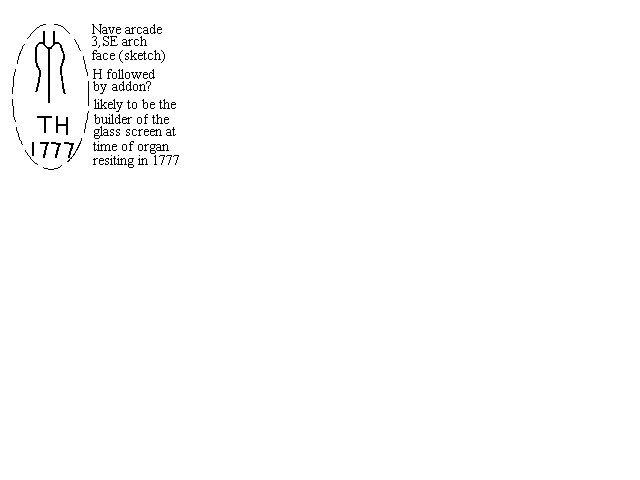 On 15 June 1777, the organ built by "Snezzler", of Oxford Road, London, was opened this month. The builder was John Snetzler (from his signature). From Blackner's description it appears to have been in the same position as its predecessor; as "a glass partition was run across the church, at the back of the Quire, in 1798". He wrote also "The instrument was supported behind the Quire by two Tuscan columns, over which David is painted as playing on his harp". The symbol and initials in my drawing (right) presumably link to this work.