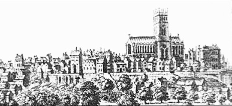 We next see the church pictured in a 1741 East panorama, by Sandby, No 4 is Plumptre House. The gardens down the eastern slope seem to have been filled with buildings and, in close-up, the South Transept roofline and pinnacle height both are the same as that of the North Transept .