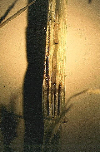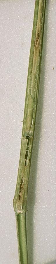 Evidence of larval feeding earlier in the season was shown in several stems in which the lower part, at least one internode, had died (e.g. bottom of the stem on the right). This death, however, had not led to stem breakage as the silicaceous fibrous tissue had remained intact and the stems, therefore, remained anchored to the soil. | ![]() |