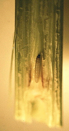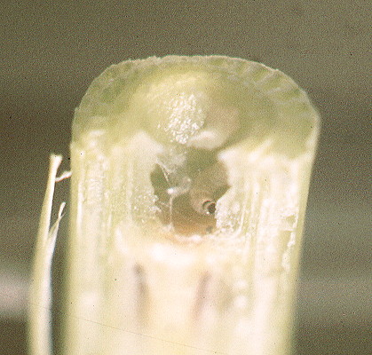 | Deadhearts and whiteheads (see earlier) In some instances, especially in the early season, deadhearts are found. In these, the damage was due to small, first- or second-instar larvae which, after boring down between the flag leaf sheath and the stem, had entered just above the top node. The larval feeding had cut a ring right around the narrow apical stem, almost severing the stem. The result, shown right, was a total interruption of the vascular system and death of the apex - hence the deadheart. Later in the season, examination of many whiteheads showed just this near excision of the apical stem (below left). It was not uncommon at that time also to find two or more small instar larvae in a single stem (below right). | ![]() | |
