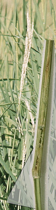 | The exit hole (left) bored prior to pupation by the last instar larva is a potential weak point, but it is small relative to the large stems characteristic of deepwater rice. Entry by bacterial or fungal rot organisms is conceivable, although the hole is sealed with silk. The large elongated stems are fibrous, and it is common for the lower submerged internodes to die without loss of the stem as a connection between the original soil roots and the upper stem. |