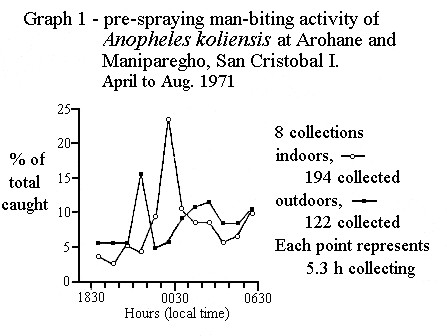 | Graph 1 shows the man-biting activity of Anopheles koliensis and the indication from these results is that there is a difference between the peaks of biting indoors and outdoors. However, this difference is perhaps not significant. | ![]() |