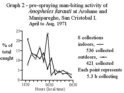 | Graph 2 shows the pre-spraying man-biting activity of' An. farauti and here there is a clearly marked difference between the peak of outdoor biting (in the hours after sunset) and the peak of indoor biting (around midnight). | ![]() |