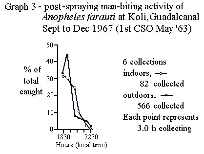 The evidence so far presented shows what is a potentially alarming situation. Here is a vector previously mainly found biting late at night and indoors (i.e. feeding on sleeping humans) and thus likely to be affected by DDT residual intradomiciliary spraying but after spraying the pattern changes, and I have other evidence to show this occurs within about 18 months after the commencement of spraying. Now we have a vector which feeds primarily out of doors and early in the evening. This correlates with the human behaviour which is to sit outside and eat and talk early in the evening, often with sleeping children lying in the parental group.