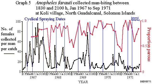 Graph 5 shows the variations in level of the total numbers of An. farauti collected between 1830 and 2100 by one collector at Koli fixed station during the years 1967 to the present time. Catches have been made at about twice monthly intervals throughout this time. I have also shown the proportion parous as a measure of daily survival, and the date of each cyclical spraying operation. The wettest months on north Guadalcanal are February and March with the driest period being August to October or November. The peak months for malaria cases are April and May.